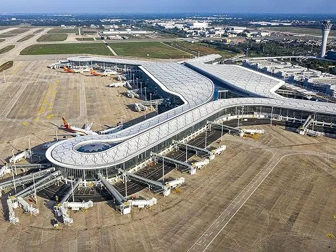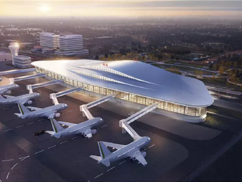 Apskritai, oro uosto terminalas su plieniniu rėmu siūlo tvirtą, lanksčią, tvarią ir vizualiai patrauklų sprendimą šiuolaikiniam oro uosto dizainui.